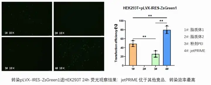 使用(yòng)jetPRIME®轉染質(zhì)粒DNA,轉染效率高于市售的其他(tā)試劑,并且可(kě)以保持良好的細胞狀态。