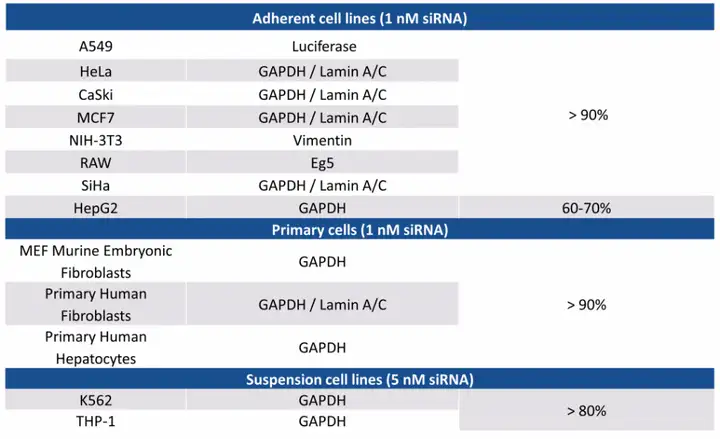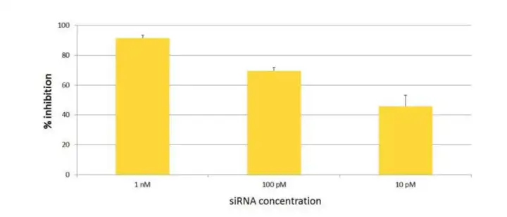 對多(duō)數貼壁細胞或原代細胞,1 nM siRNA能(néng)夠達到超過90%的基因沉默。對于懸浮細胞,使用(yòng)5 nM siRNA依然能(néng)達到80%的沉默效率。