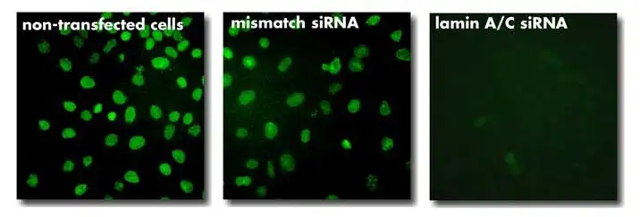 使用(yòng)INTERFERin® 轉染1 nM anti-lamin A/C siRNA可(kě)以顯著降低lamin 的基因表達至幾乎檢測不到的水平 (Fig. 3).