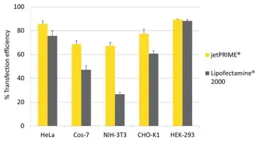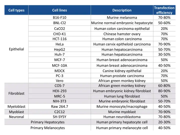 在不同細胞系中(zhōng)使用(yòng)jetPRIME®的轉染效率同樣,您也可(kě)以在我們的數據庫中(zhōng)查詢更多(duō)的數據。
