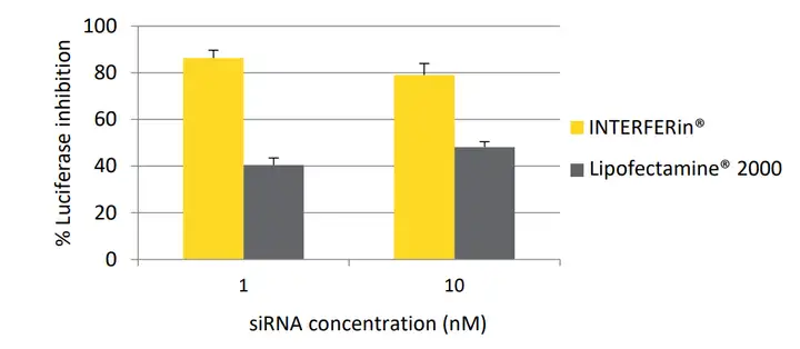 使用(yòng)INTERFERin®遞送1 nM siRNA 就可(kě)以達到具(jù)有(yǒu)選擇性的高效基因沉默,而競争産(chǎn)品需要至少10 nM siRNA來達到50%的基因沉默 (Fig. 1).
