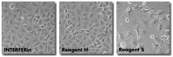 在保持細胞活率方面,INTERFERin®優于其他(tā)轉染試劑。在轉染1 nM siRNA48小(xiǎo)時後, 使用(yòng)INTERFERin®的細胞很(hěn)健康, 而使用(yòng)reagent S 的細胞可(kě)以觀察到明顯的細胞毒性(Fig. 4).
