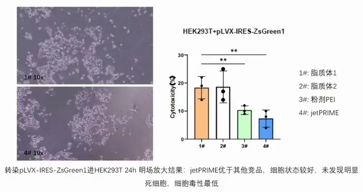毒性小(xiǎo):質(zhì)粒和轉染試劑用(yòng)量小(xiǎo) 極佳的細胞活率