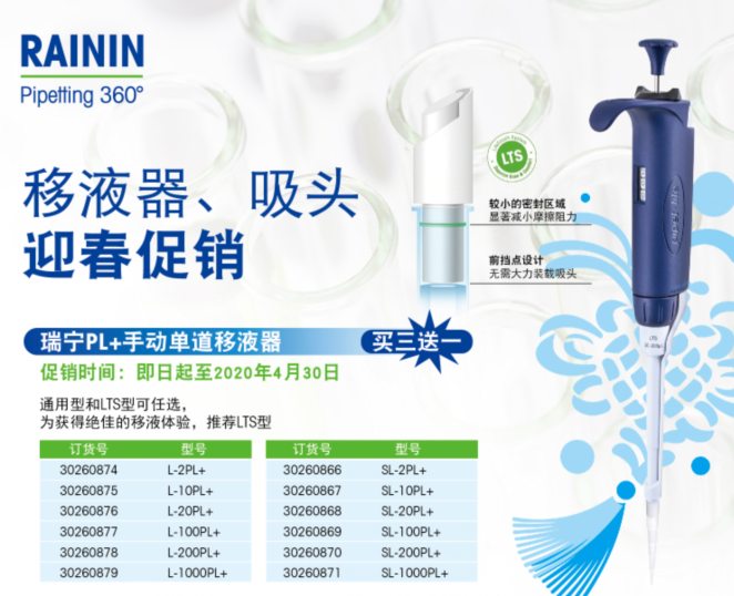 瑞甯PL+手動單道移液器買三送一(促銷時間:即日起至2020年4月30日)